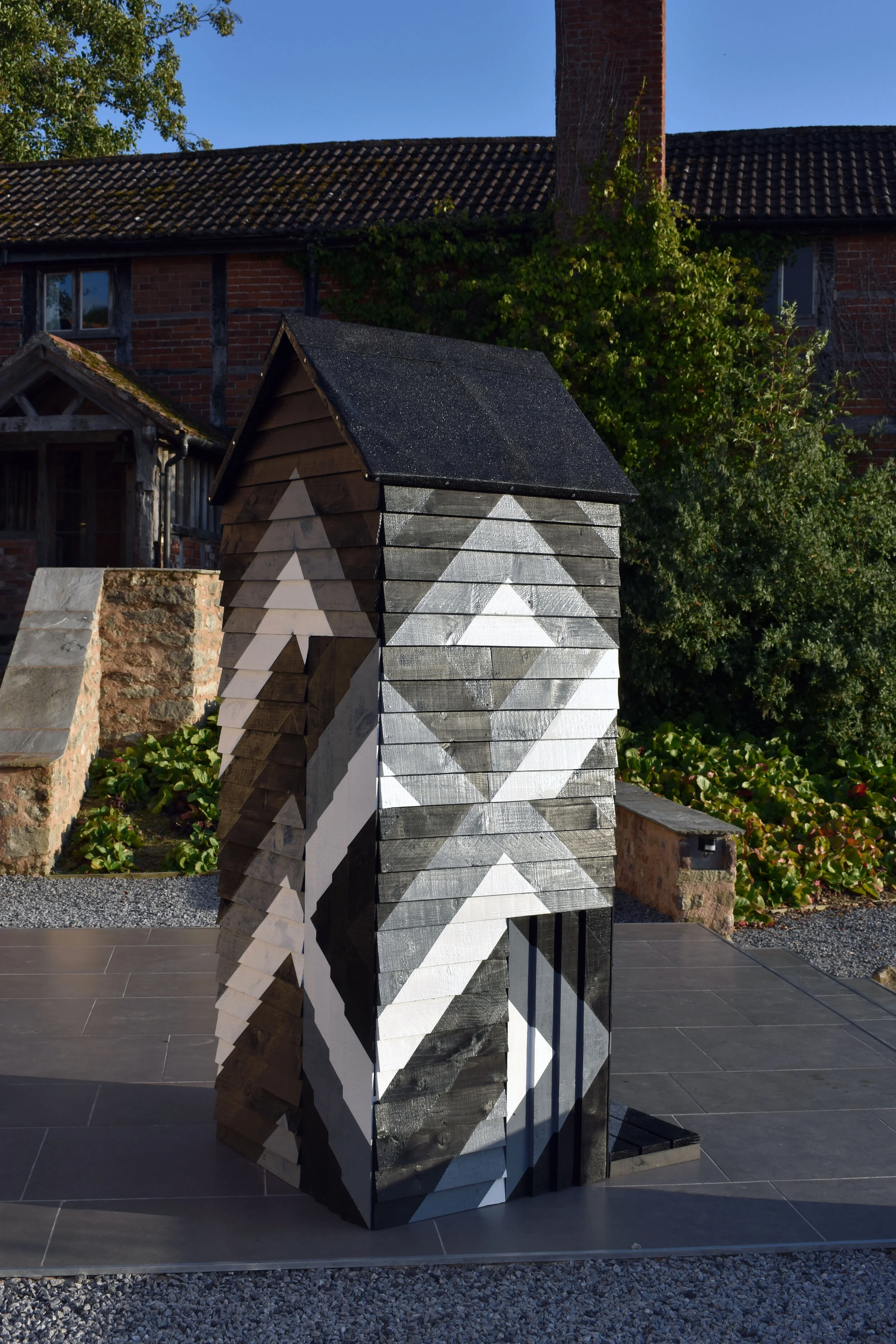 A structure for displayed viewing, its painted surface is inspired by the marine artist Norman Wilkinson’s ‘dazzle’ painting technique (sometimes known as ‘razzle dazzle’), which was developed at the Royal Academy of Arts to protect ships during WW1 by making it more difficult for observers to judge their exact form, direction and velocity. Diagrams designed at the RA were used by other artists to paint the vessels, one of whom was the Vorticist Edward Wadsworth. More recently the principles of dazzle painting have been used in Formula 1 testing to confound rival teams and to hamper facial recognition software.